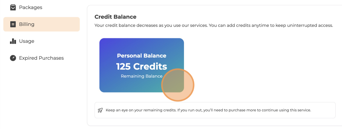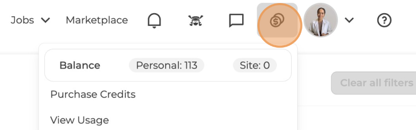 Hover over and select the dollar icon to view your instant credit balance. Then choose Purchase Credits or Usage to proceed to the Credits page.