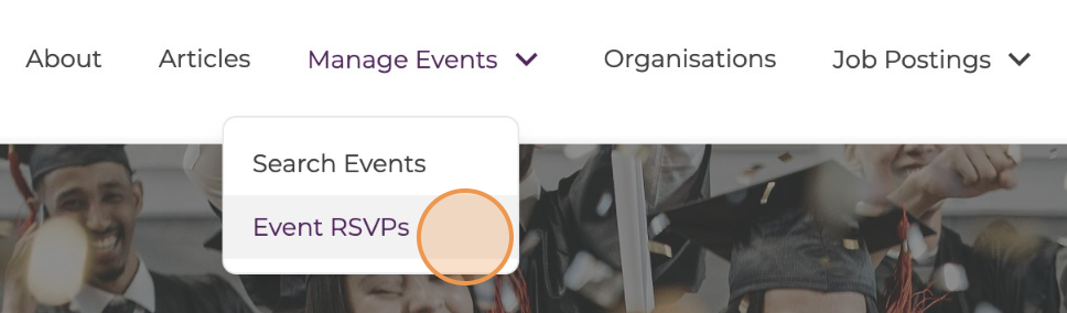 2. You will land on your dashboard upon successful login. Hover over Manage Events to expand the menu and click Event RSVPs.