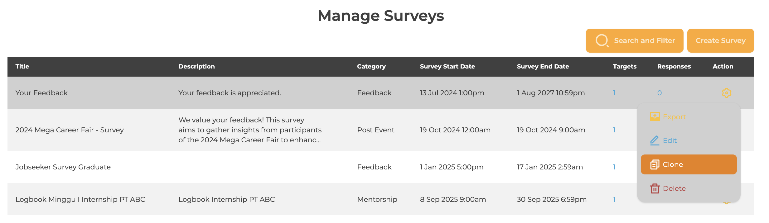 To clone a survey, click the gear icon, select clone, and then click Proceed to Clone.