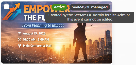 Events created by SeeMeSOL Admins for site admins are automatically approved and are marked with the SeeMeSOL Managed badge. These events cannot be edited through the Manage Events page.