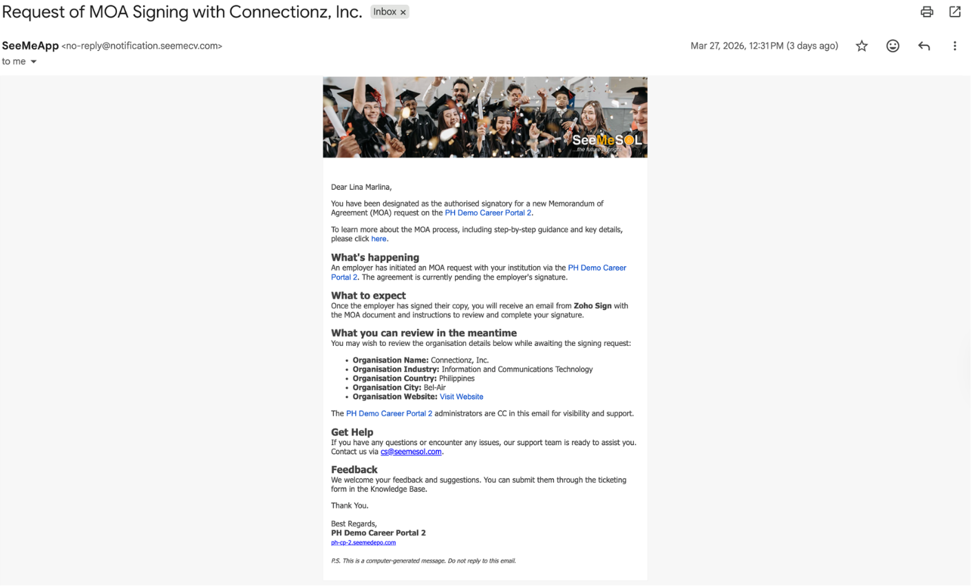 1. When an employer submits an agreement request to your Career Portal, your registered Agreement Signatory Email will receive a notification email from SeeMeSOL.