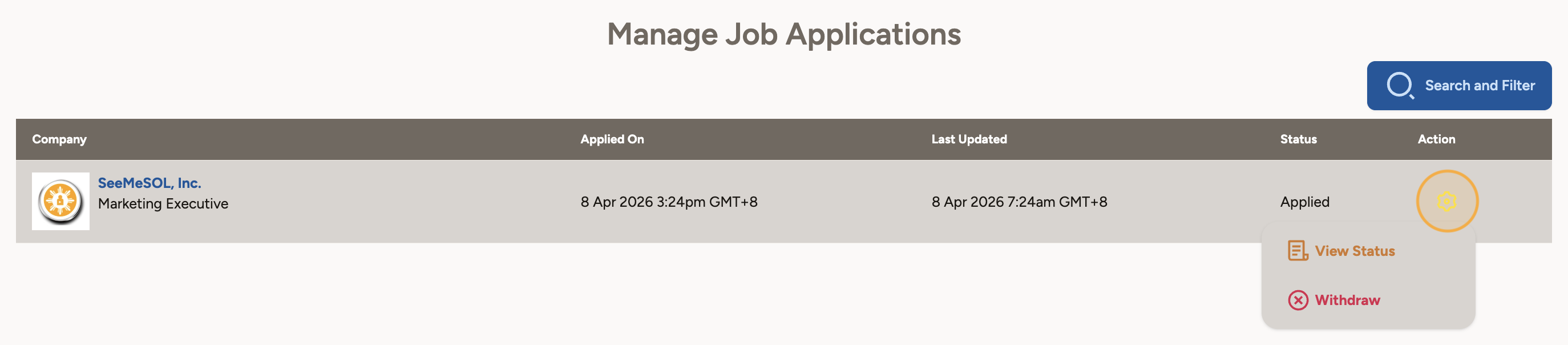 8. Click the gear icon to view the application status or to withdraw it.