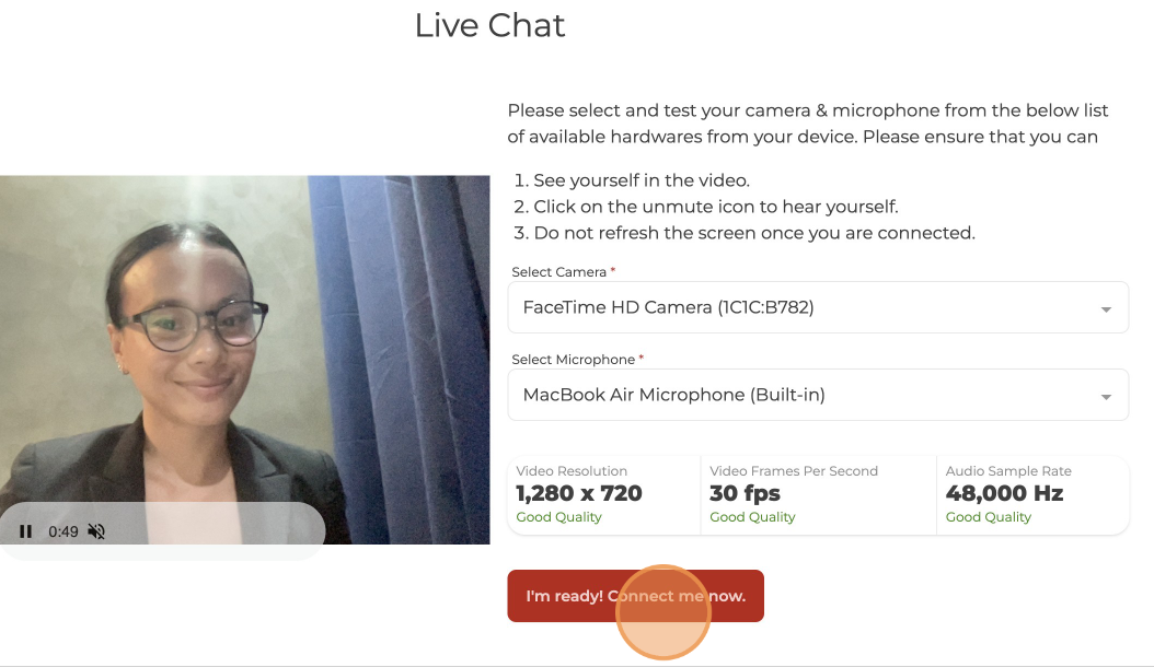 4. Make sure you are camera-ready. Check your device — allow access to your camera and microphone, and ensure they are working properly. Once everything is set, click I’m Ready! Connect me now! to begin.