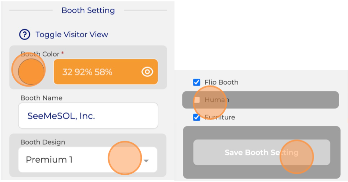 4. Customize your booth by selecting your company’s brand color, choosing a preferred booth design, and adding furniture or human icons as desired. Click Save Booth Setting to apply and save your changes.