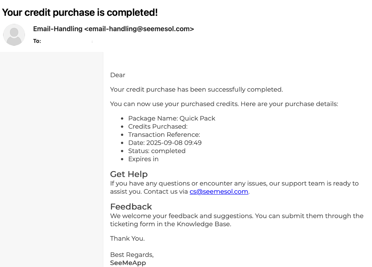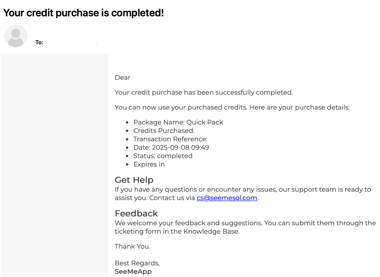 You will also receive an email confirmation that your credit purchase has been completed. See the sample email below.