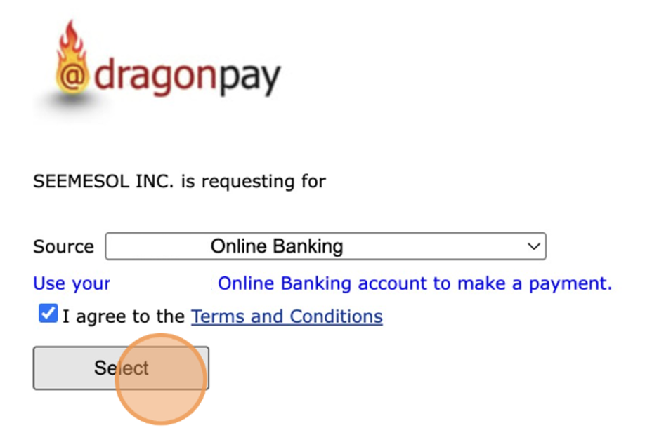 4. Choose your Source of funds, tick the box to agree to the Terms and Conditions, and then click Select to proceed.