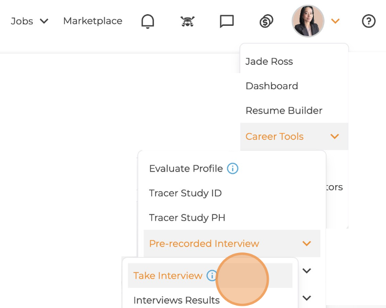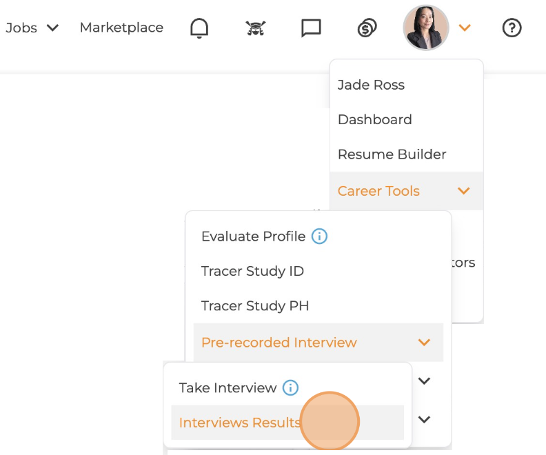 1. Hover over your profile icon to expand the menu, click Career Tools, then select Pre-recorded Interview, and finally choose Interview Results.