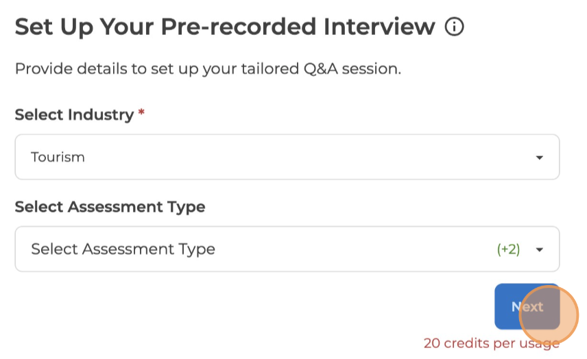 3. You will be taken to the Pre-recorded Interview setup page. Choose the Industry you would like to practice for, and select the Assessment Type you want to focus on. Then, press Next.