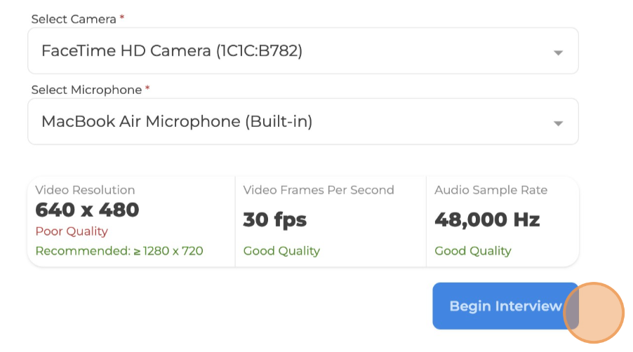 4. You will arrive at the Set Up Your Devices page. Test your camera and microphone to ensure they are working properly. Once everything is set, click Begin Interview.