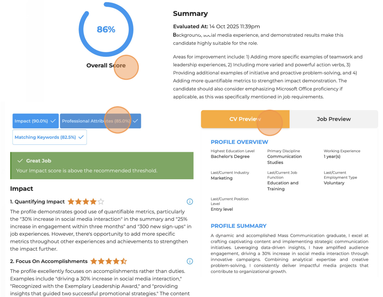 4. Check your Summary, Impact, Professional Attributes, and Matching Keywords results.