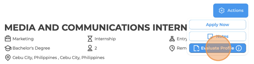 2. You will land on your dashboard upon successful login. Hover over Jobs to expand the menu and select Search Jobs. You will see the jobs listing available which are registered and verified by the site admin. Hover the cursor over the jobs listing. Click View Job. You will see the job specifications and job requirements for the job selected. Click Actions and select Evaluate Profile.