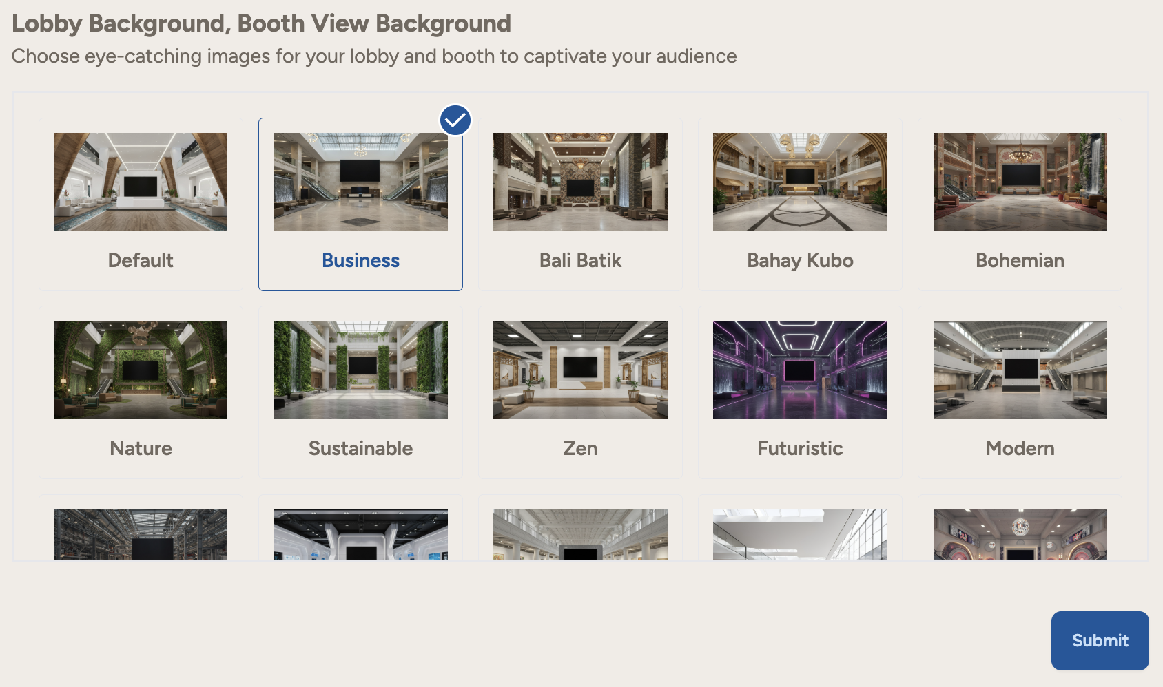 Lobby Background, Booth View Background: Choose eye-catching images for your lobby and booth to captivate your