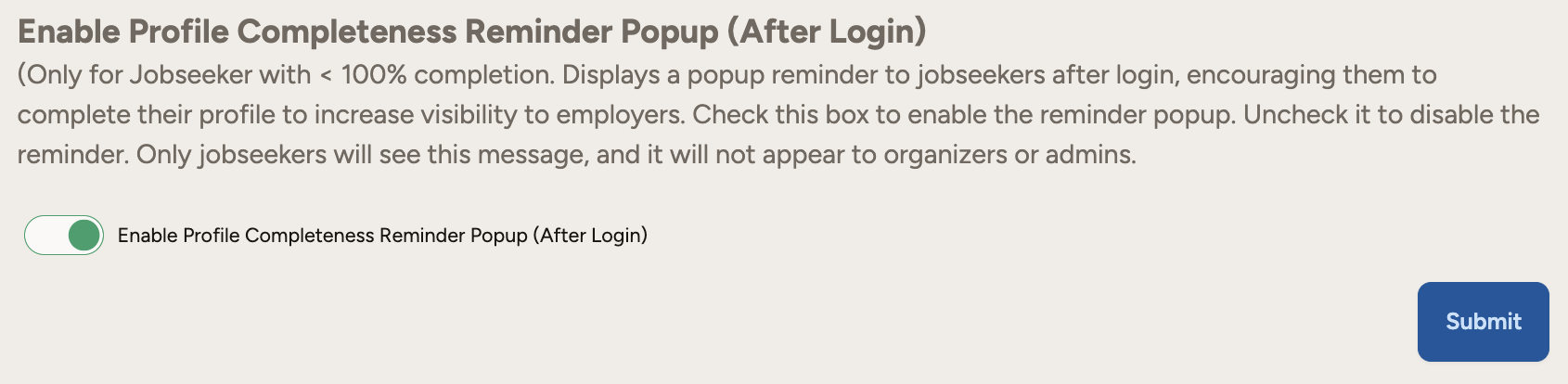 Enable Profile Completeness Reminder Popup: Enable this popup to remind and encourage jobseekers to complete their profile.