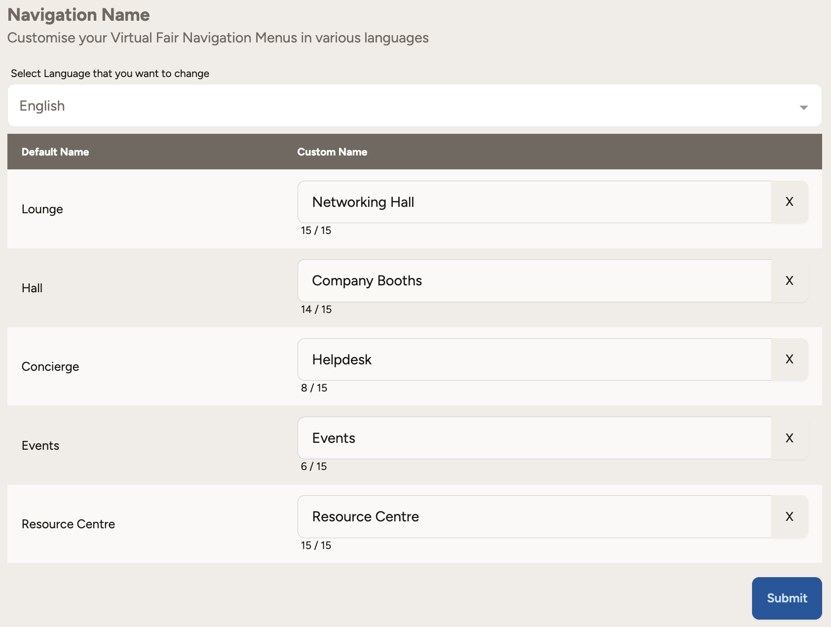 Navigation Name: Customise your Virtual Fair navigation menus in various languages.