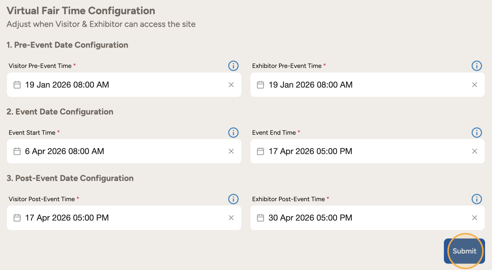 Virtual Fair Time Configuration: Adjust the access times for visitors and exhibitors to the site.