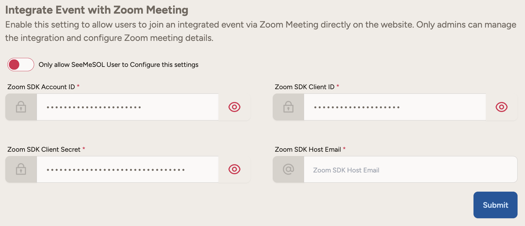Integrate Event with Zoom Meeting: Enable this setting to allow users to join an integrated event via Zoom Meeting directly on the website.
