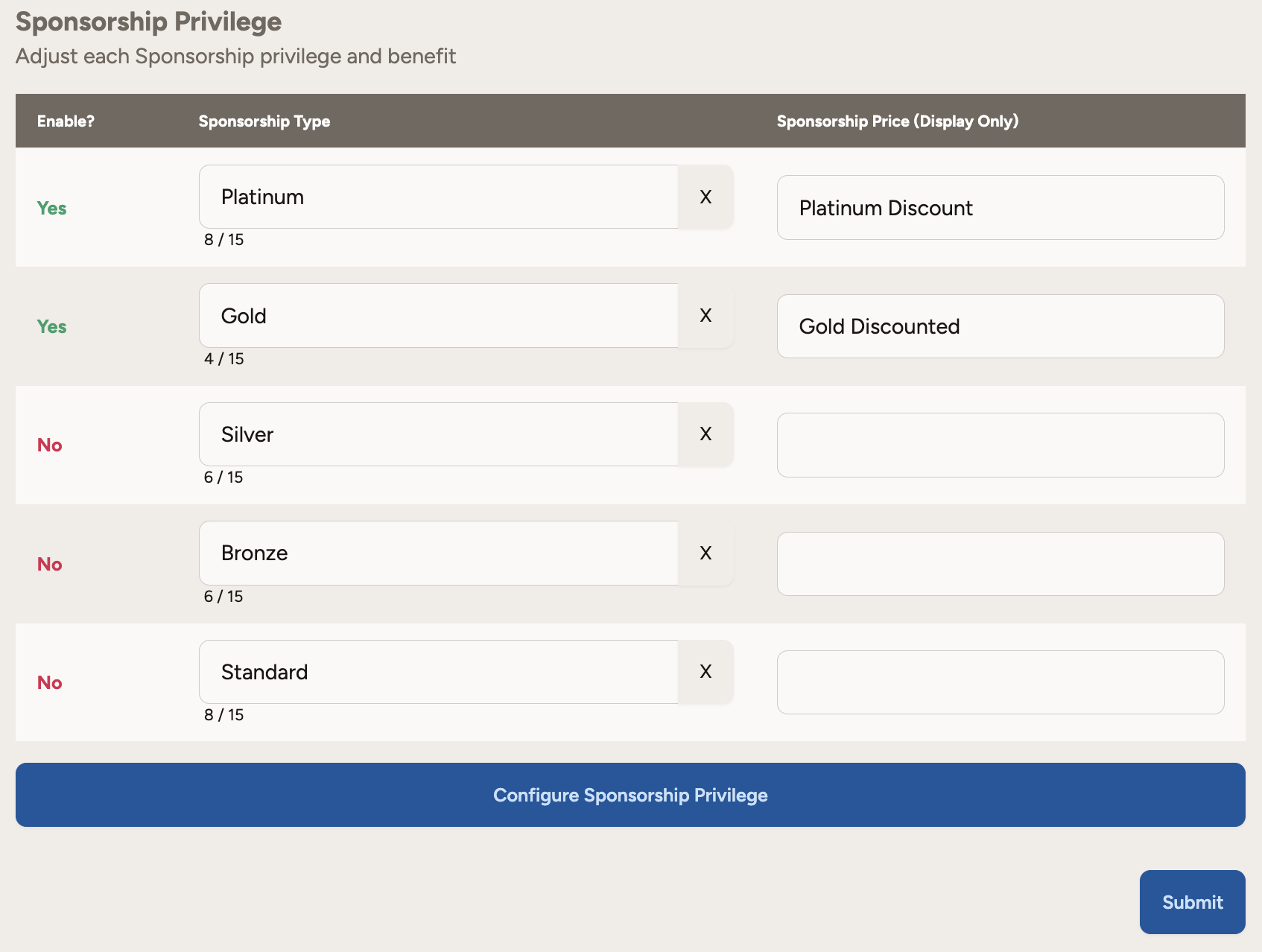 Sponsorship Privilege: Adjust each sponsorship privilege and benefit.