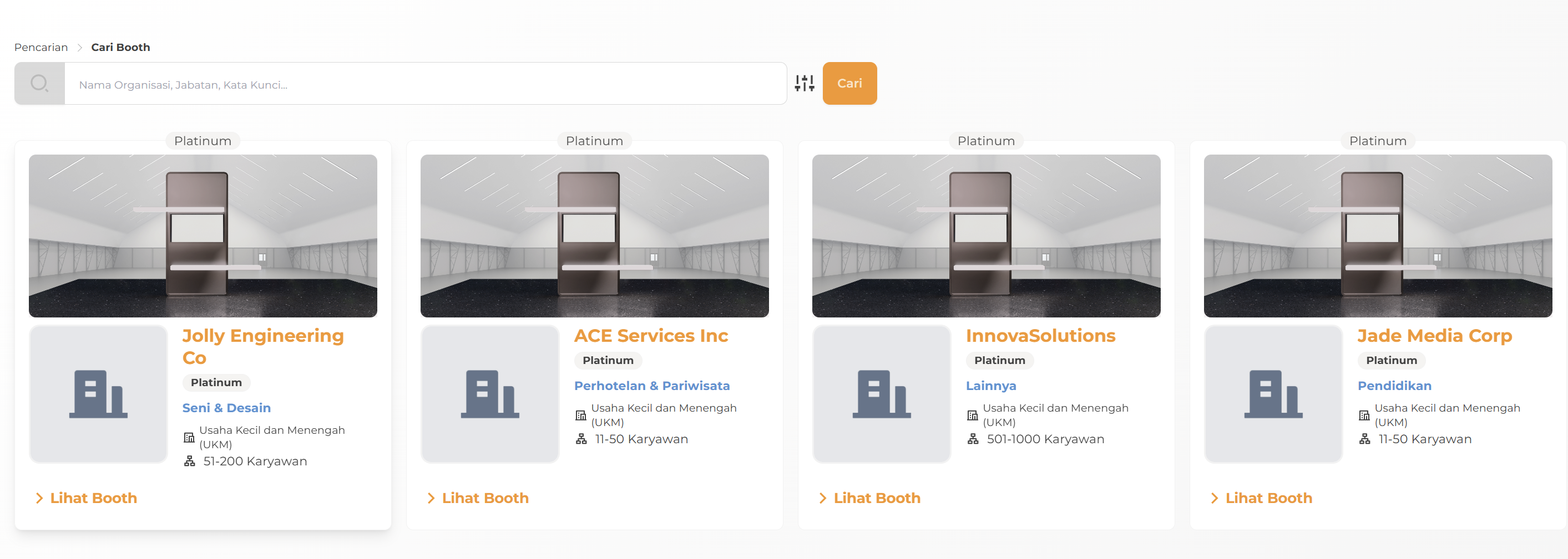 Halaman Ruang Pameran menampilkan semua organisasi yang telah terdaftar dan disetujui di situs.