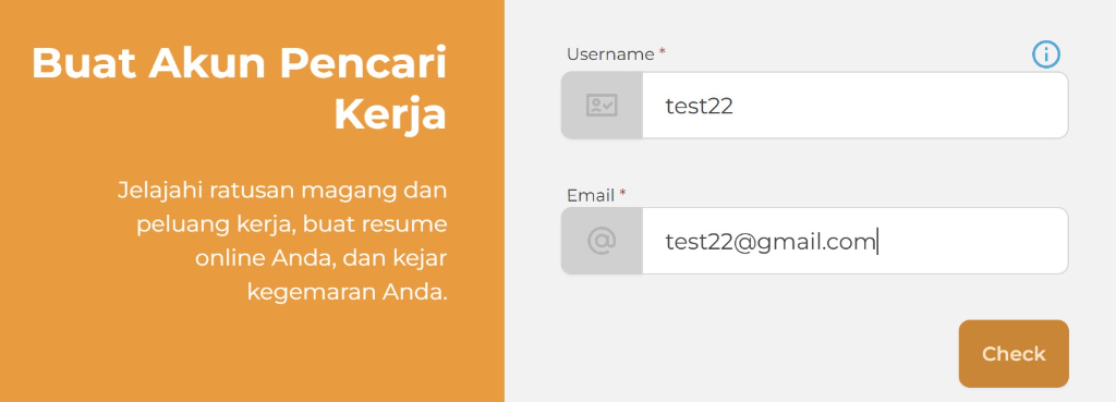 2. Masukkan nama pengguna dan alamat email yang kamu inginkan. Klik Periksa untuk memastikan tidak ada duplikasi.
