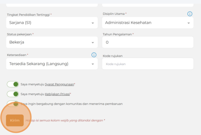 3. Isi semua kolom yang wajib diisi. Aktifkan tombol untuk menyetujui Ketentuan Penggunaan dan menerima Kebijakan Privasi sebelum mengklik Kirim.