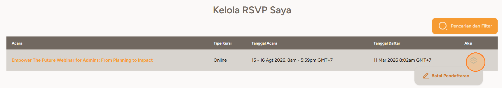 5. Anda dapat mengelola dan meninjau RSVP pada halaman Kelola RSVP. Jika diperlukan, Anda juga dapat membatalkan pendaftaran.