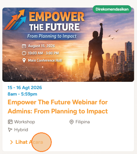 3. Anda akan melihat daftar acara yang tersedia di portal dan ditujukan untuk Anda selaku admin portal. Klik Lihat Acara untuk melihat detail acara, termasuk deskripsi, tanggal dan waktu, lokasi, serta tautan terkait.