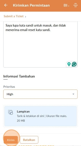 2. Isi semua informasi yang diperlukan. Anda juga dapat mengunggah tangkapan layar dan rekaman layar untuk membantu kami memahami isu Anda lebih baik dan menemukan solusinya. Klik Kirim. Tim Customer Success kami akan segera merespons Anda.