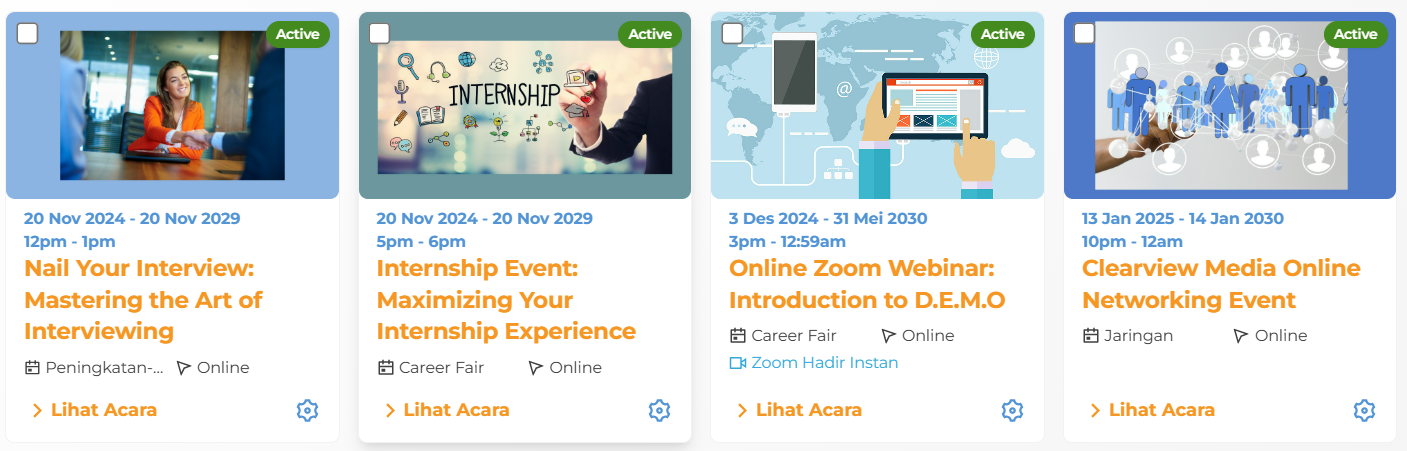 Kelola Acara sebagai rangkaian Virtual Fair Anda, tinjau pengajuan acara, batalkan, edit, atau tolak sesuai kebutuhan. Seringlah memeriksa event baru dan yang menunggu persetujuan agar konten di situs Anda selalu terbaru dan relevan. Hal ini membantu menjaga kualitas dan ketepatan waktu informasi yang ditampilkan di situs Anda.