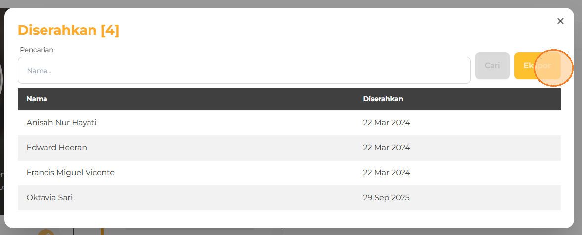 4. Jendela pop-up akan terbuka dengan daftar alumni yang telah memasukkan studi tracernya. Klik Ekspor.