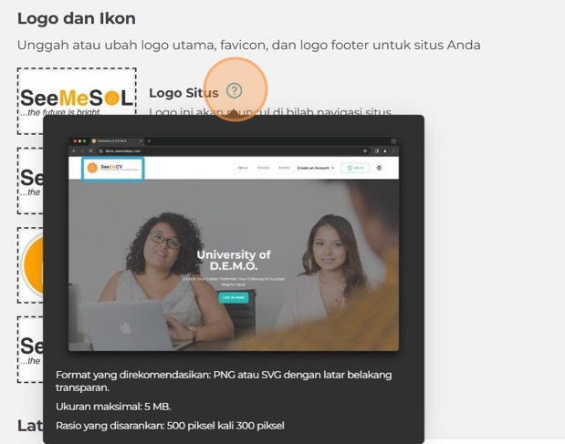 Logo and Ikon – Unggah file logo beresolusi tinggi Anda. Klik ikon tooltip untuk melihat di mana ikon-ikon tersebut akan ditampilkan setelah diunggah, serta format yang diperbolehkan dan ukuran maksimum.