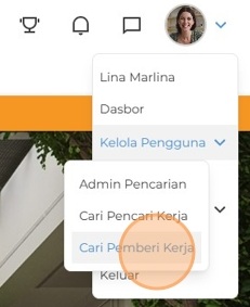 2. Setelah berhasil masuk, Anda akan diarahkan ke halaman utama. Arahkan kursor ke ikon profil untuk membuka menu, lalu klik Kelola Pengguna, kemudian pilih Cari Pemberi Kerja.
