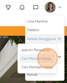 2. Setelah berhasil masuk, Anda akan diarahkan ke halaman utama. Arahkan kursor ke ikon profil untuk membuka menu, lalu klik Kelola Pengguna, kemudian pilih Cari Pencari Kerja.