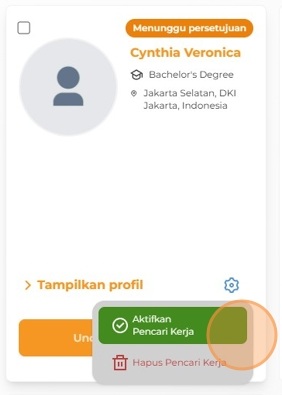 3. Anda akan berada di halaman daftar pencari kerja. Untuk menyetujui registrasi pencari kerja, klik ikon roda gigi, lalu pilih Aktifkan Pencari Kerja.
