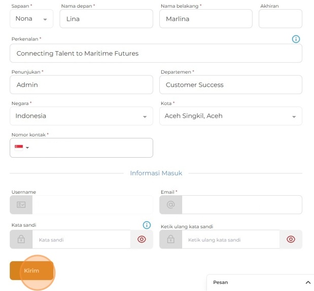 4. Anda akan melihat informasi yang telah Anda berikan saat pendaftaran. Tinjau kembali informasi tersebut dan lakukan pembaruan atau koreksi jika diperlukan. Anda juga dapat memperbarui kata sandi login Anda. Lewati langkah ini jika tidak perlu. Klik Kirim untuk menyimpan semua perubahan.