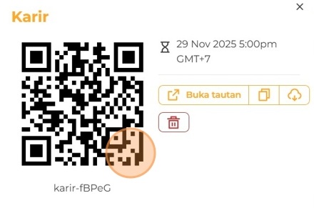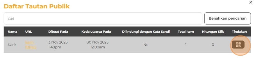6. Untuk melihat tautan publik dan kode QR dari acara yang telah Anda buat, klik Daftar Tautan Publik. Di halaman ini, Anda dapat melihat detail setiap tautan yang telah dibuat, termasuk jumlah klik. Klik ikon Kode QR untuk membuka tautan, menyalinnya, mengunduh kode QR, atau menghapusnya jika sudah tidak diperlukan.