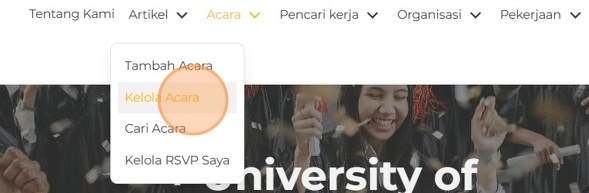 2. Setelah berhasil login, Anda akan diarahkan ke dasbor. Arahkan kursor ke menu Acara, lalu klik Kelola Acara.