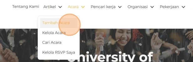 2. Setelah berhasil login, Anda akan diarahkan ke dasbor. Arahkan kursor ke menu Acara, lalu klik Tambah Acara.