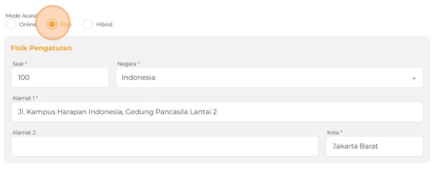 Pilih Fisik (Offline) jika acara diselenggarakan di lokasi fisik. Tentukan jumlah kuota peserta dan tuliskan alamat lengkap atau lokasi acara.