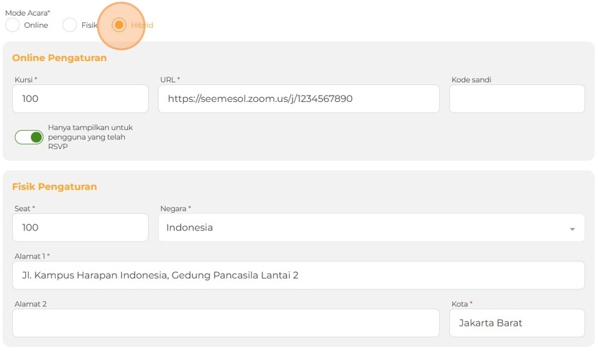 Pilih Hibrid jika acara diselenggarakan secara daring dan fisik secara bersamaan.