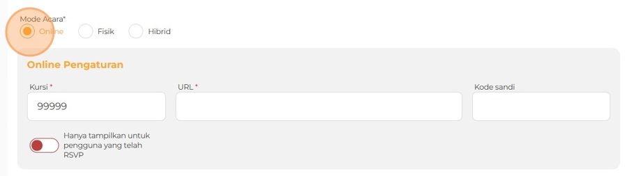 6. Pilih Mode Acara dengan menentukan apakah acara akan diadakan secara online, fisik (offline), atau hibrid.