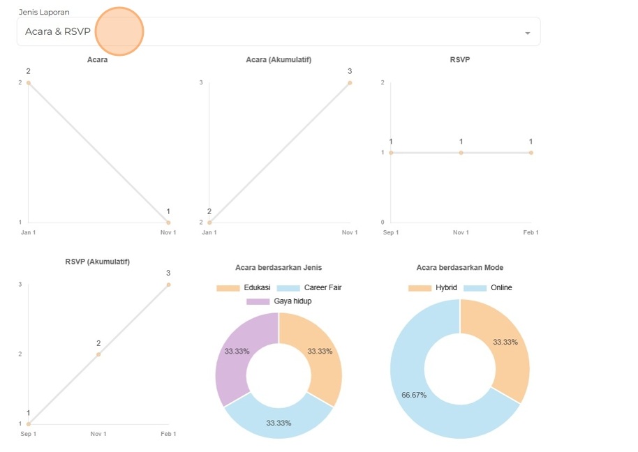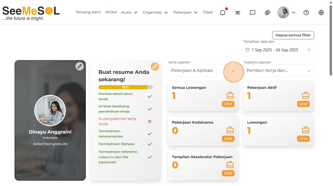 Dasbor menampilkan ringkasan detail dan grafik dari pekerjaan, lamaran, acara, dan RSVP Anda. Data ini dapat difilter berdasarkan tanggal untuk memudahkan, serta menampilkan aktivitas terbaru Anda di portal.