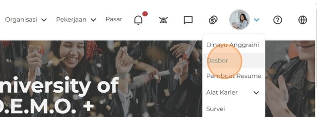 Setelah berhasil masuk, Anda akan langusng diarahkan masuk ke dasbor. Untuk kembali ke dasbor setelah menavigasi tab lain, arahkan kursor ke ikon profil Anda untuk memperluas menu dan klik Dasbor.