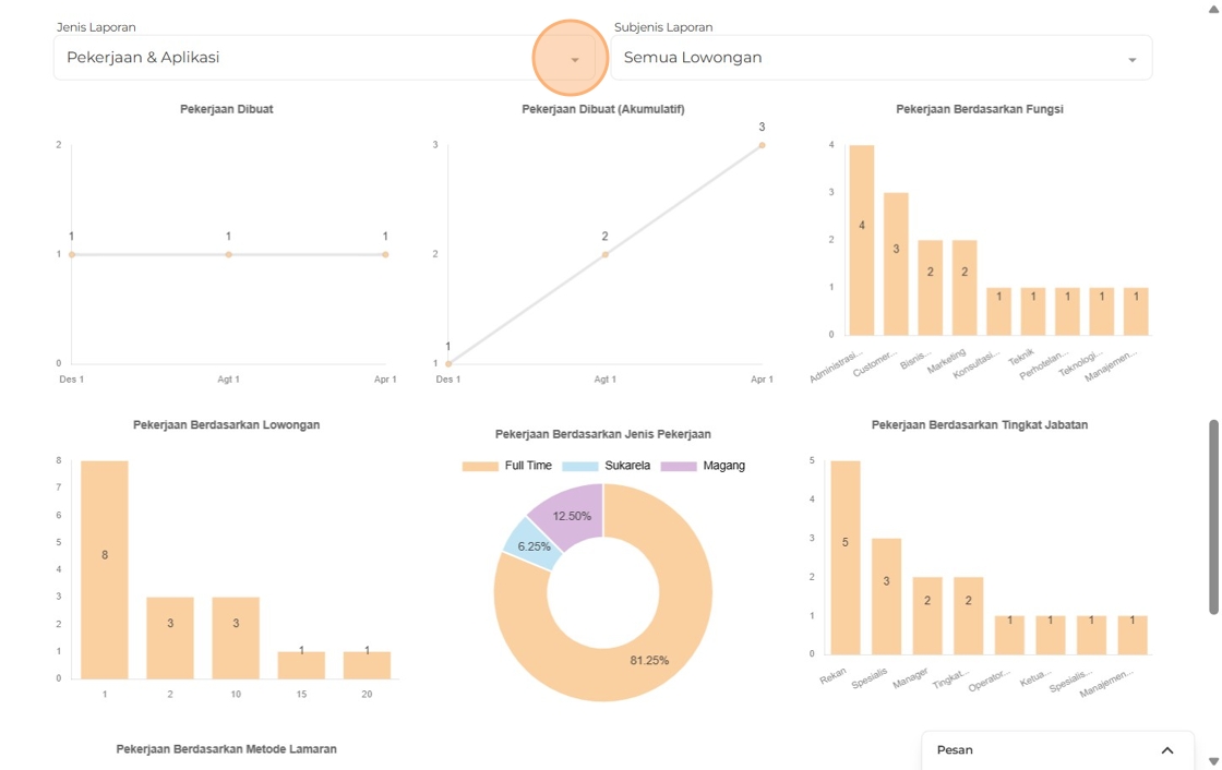 Dashboard menampilkan ringkasan terperinci dan grafik dari pekerjaan, lamaran, acara, serta RSVP Anda. Anda dapat memfilter data berdasarkan tanggal untuk tampilan yang lebih jelas, dan halaman ini juga menampilkan aktivitas terbaru Anda di portal. Selain itu, Anda juga dapat mengedit informasi akun dan profil langsung dari halaman ini.