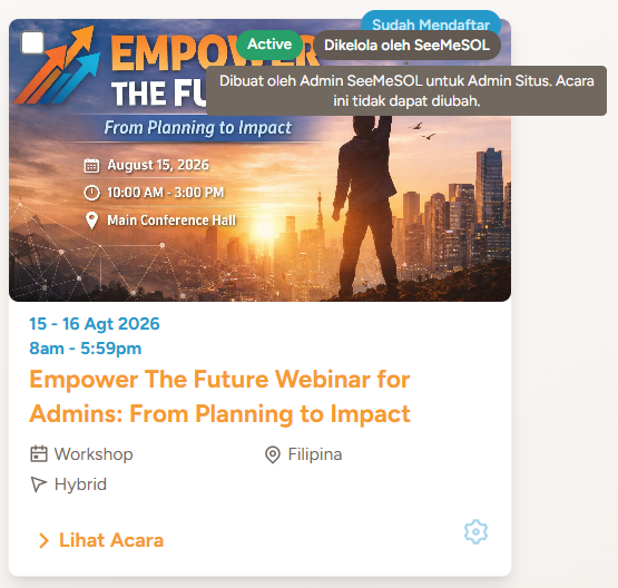 Acara yang dibuat oleh SeeMeSOL Admin untuk admin portal akan langsung disetujui secara otomatis, tidak dapat diedit, dan ditandai dengan badge “Dikelola oleh SeeMeSOL”.