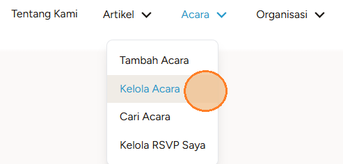 2. Setelah berhasil login, Anda akan diarahkan ke Dasbor. Arahkan kursor ke menu Acara untuk menampilkan opsi, lalu pilih Kelola Acara.