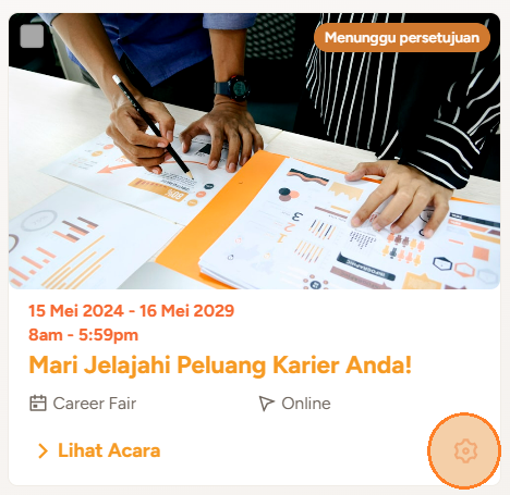 3. Anda akan melihat daftar acara yang menunggu review serta acara yang sudah aktif atau dipublikasikan. Klik ikon gear pada acara untuk memperbarui status atau melakukan perubahan pada event tersebut.