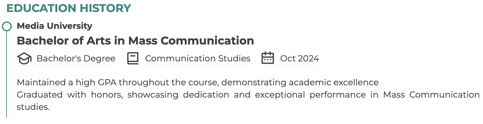 Educational Background: Lengkapi bagian ini dengan menyoroti hal-hal yang membuat Anda menonjol, seperti beasiswa, prestasi, penghargaan, atau peran kepemimpinan selama kuliah. Bagikan pencapaian akademik Anda—semakin banyak entri semakin baik.