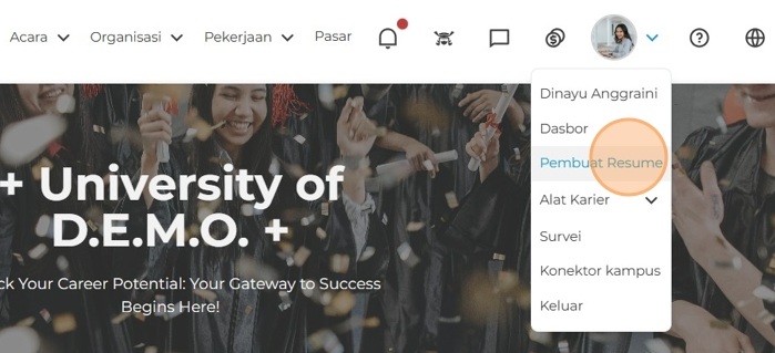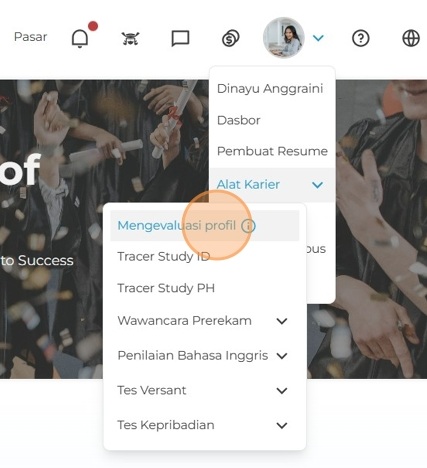 2. Setelah berhasil login, Anda akan masuk ke dasbor. Arahkan kursor ke ikon profil Anda untuk membuka menu, pilih Alat Karir lalu Mengevaluasi Profil.