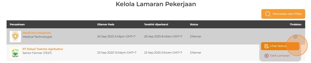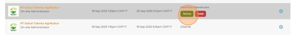 3. Anda akan melihat daftar dan status semua pekerjaan yang telah Anda lamar. Klik ikon roda gigi untuk melakukan tindakan pada lamaran Anda, atau langsung klik Terima atau Tolak untuk permintaan wawancara.