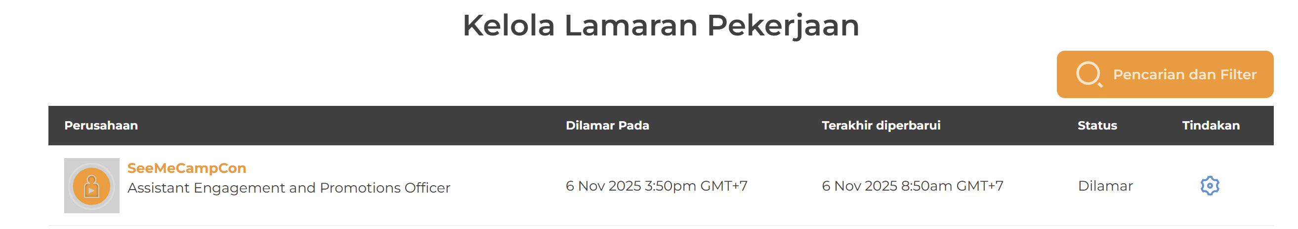 Anda dapat melihat detail seperti tanggal lamaran dan status terbaru dari setiap pengajuan. Fitur ini memberikan gambaran yang jelas untuk membantu Anda memantau dan mengelola lamaran pekerjaan dengan lebih efisien.